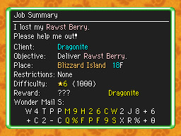 | License | This file is subject to copyright. Copyright is most likely held by the company that published the game or the media portrayed. Mystery Dungeon Franchise Wiki's use of this work qualifies as fair use under United States copyright law, or the author's permission is given. It is used on the wiki only in the belief that the information the file portrays is designed to be an accompaniment to playing the game or media, and its use here will not:
