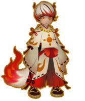 Around Kokatsu's physical body, his spirit takes the appearance of a little boy with the tail of a fox, circular red eyes, and hair covering his forehead. Both the tail and the hair are white with red tips, and the hair also has additional red highlights. He wears white and red clothes with markings that represent sunshine, a collar made of yellow spheres around his neck, and yellow sandals with brownish dark red socks.